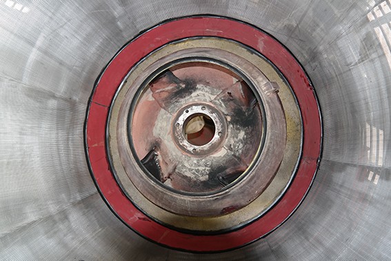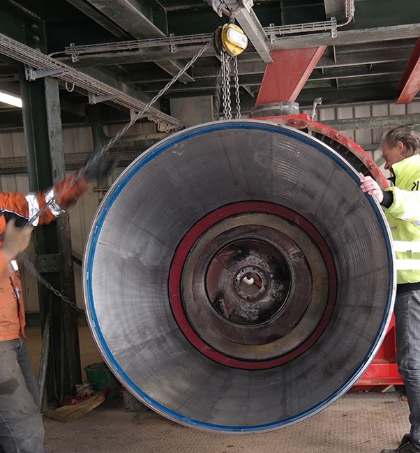 Abbildung unten links: Schweissspalt-Siebkorb beim Einbau in die Zentrifuge